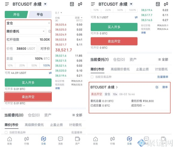 3、选择账户模式、委托类型,输入价格、数量,点击买入开多(看涨)或卖出开空(看空)。未成交的委托挂单可单击撤单撤销委托。