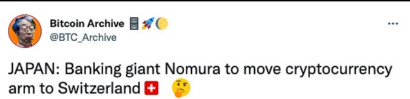 日本银行业巨头野村将加密货币部门迁至瑞士
