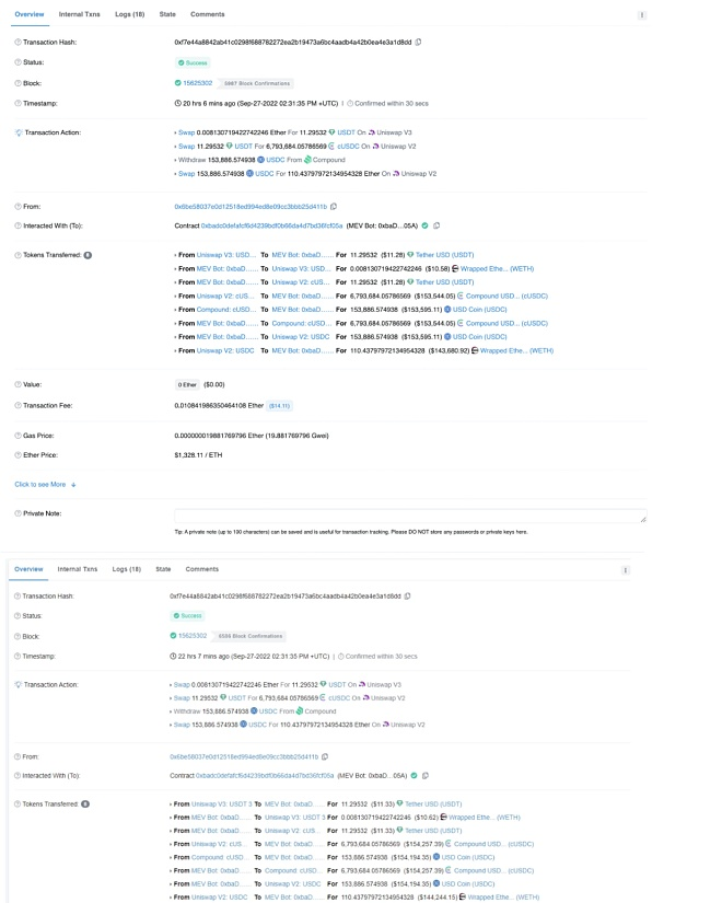此前,该MEV机器人本身也刚刚完成了一笔交易,从仅仅11美元的USDT交易中获利了15万美元。