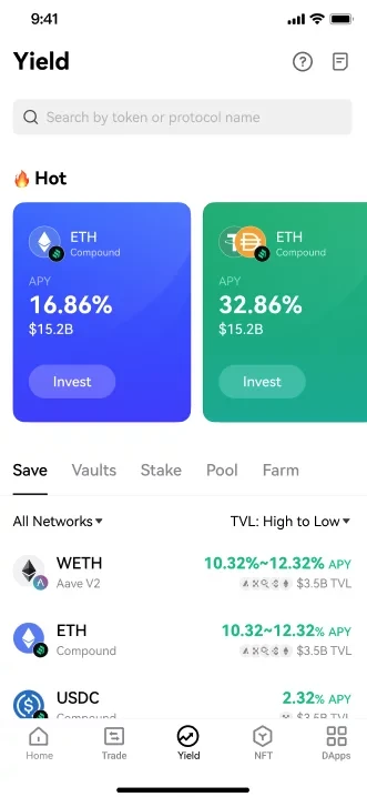 Web3赚币(Yield)产品是内置于欧易Web3钱包的全新功能模块,同时聚合了DEX交易和投资理财两项功能,以帮助用户在不同的公链生态和协议项目中便捷切换,高效迁移,最快参与优质项目。