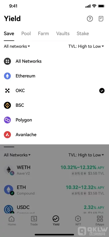 Web3赚币(Yield)目前已接入了ETH、BSC、OKC,Avalanche,Polygon这5条公链,支持Compound和AaveV2等12个协议,后续还将链接更多公链和协议,逐渐覆盖加密圈绝大多数应用。