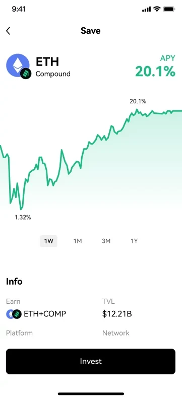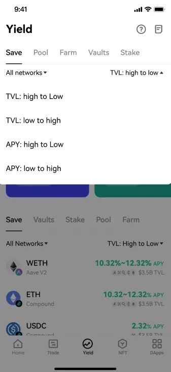 解决方案:Web3赚币(Yield)因为聚合了绝大多数链上协议,产品主页可以清晰展示主流协议应用下投资品的APY排名,用户可在查看排名列表的同时直接点击进入选中的项目,一键完成投资,缩短投资决策路径。