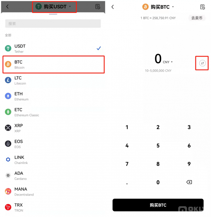 第二步:将购买币种切换为BTC,输入需要购买的金额/数额。点击如图所示的按钮即可完成“按金额购买”/“按币种数量购买”的切换。