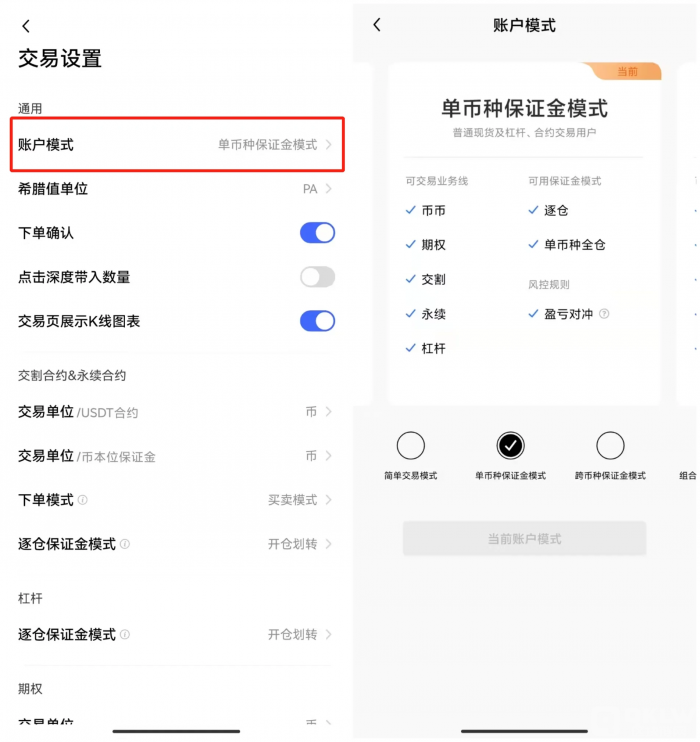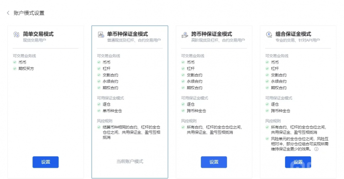 单币种保证金模式:适合有交易经验的散户和量化用户选择,用户可在统一账户模式下点击“交易设置”按钮→设置账户模式→选择单币种保证金模式,完成之后答题即可激活。