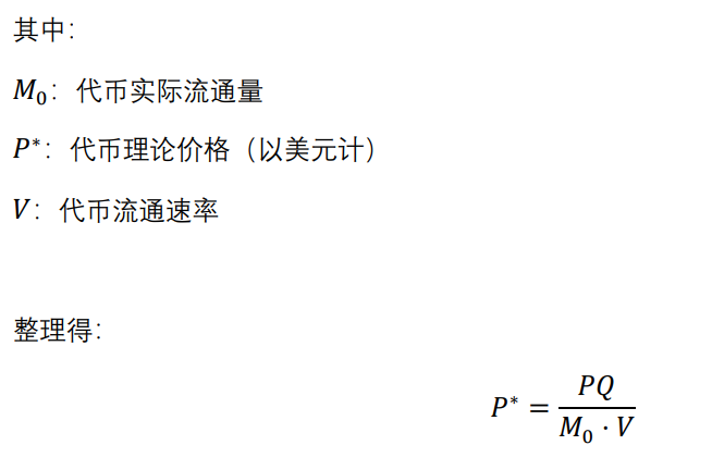 理论价格推导:与⼀般的国家法币不同,⽣态代币价格通常以美元计价,因此在模型中,代币的流通供应总额(M)可拆分为: