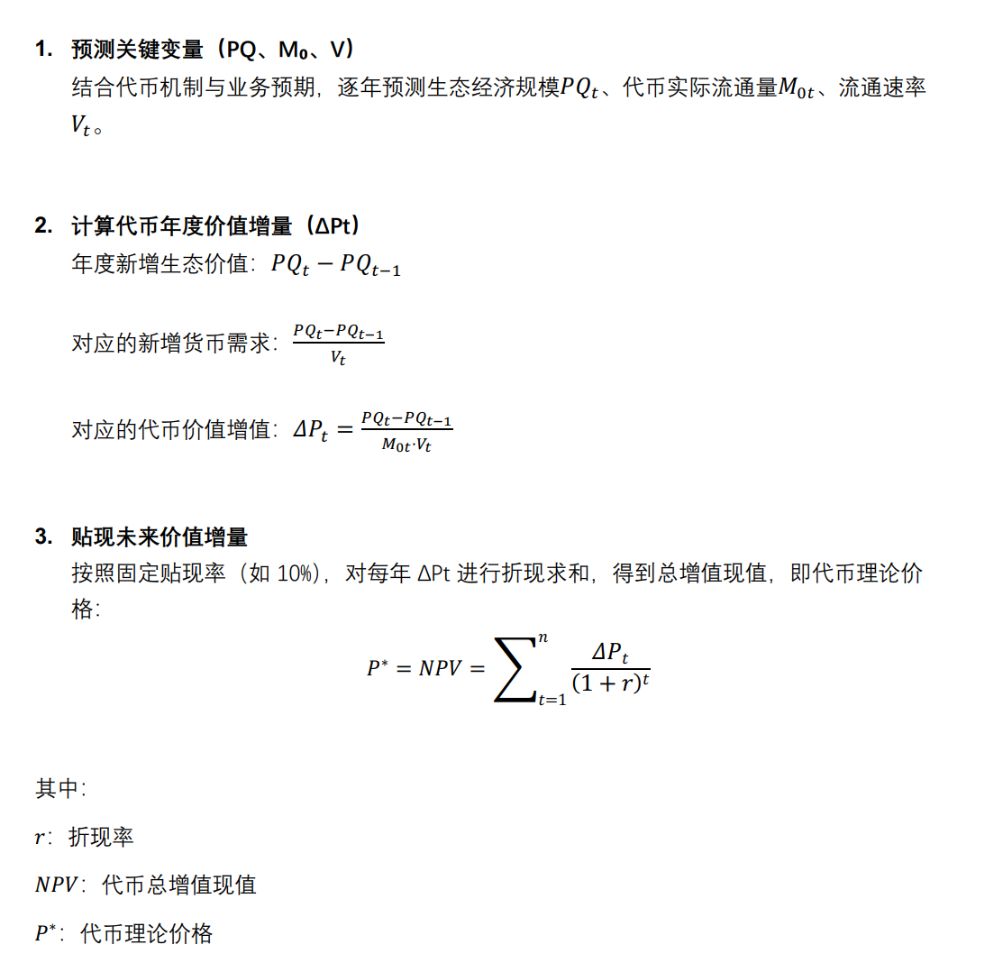本⽅法论通过将货币⽅程式(MV = PQ)与贴现现⾦流⽅法(DCF)结合,构建了⼀套适⽤于价值功能性代币的系统性估值模型: