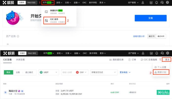 当完成4项准备条件,就可以开始申请成为商家,操作过程如下: 打开欧易官网首页,点击【买币】—【C2C买币】;在新页面点击【更多】—【商家计划】—【立即申请】。