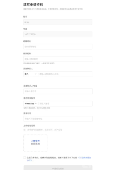 在申请页面,按要求填写邮箱地址、昵称、居住地址等信息并上传住址证明,点击【申请成为商家】。