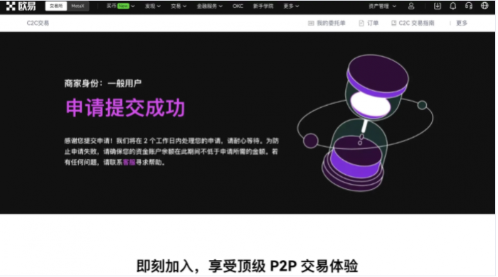 如何成为C2C认证商家?数字货币交易平台C2C商家申请流程,成为欧易认证商家,需要您按要求完成实名认证、保证金缴纳和资料提交等,待平台审核通过后,即可成为C2C交易商家。具体操作如下: